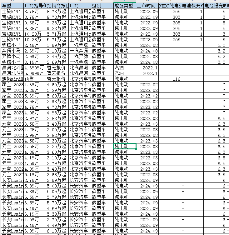 车型 厂商指导价(元) 经销商报价 厂商 级别 能源类型 上市时间 NEDC纯电续航里程(km) 电池快充时间(小时) 电池慢充时间(小时) 电池快充电量范围(%) 最大功率(kW) 最大扭矩(N·m) 车身结构 电动机(Ps) 长*宽*高(mm) 官方0-100km/h加速(s) 最高车速(km/h) 整车质保 整备质量(kg) 最大满载质量(kg) 长度(mm) 宽度(mm) 高度(mm) 轴距(mm) 前轮距(mm) 后轮距(mm) 接近角(°) 离去角(°) 车门开启方式 车门数(个) 座位数(个) 后备厢容积(L) 风阻系数(Cd) 电机类型 电动机总功率(kW) 电动机总马力(Ps) 电动机总扭矩(N·m) 后电动机最大功率(kW) 后电动机最大扭矩(N·m) 驱动电机数 电机布局 电池类型 电芯品牌 电池能量(kWh) 电池能量密度(Wh/kg) 百公里耗电量(kWh/100km) 三电系统质保 快充功能 简称 挡位个数 变速箱类型 驱动方式 前悬架类型 后悬架类型 助力类型 车体结构 前制动器类型 后制动器类型 驻车制动类型 前轮胎规格 后轮胎规格 备胎规格 主/副驾驶座安全气囊 前/后排侧气囊 前/后排头部气囊(气帘)ABS防抱死 制动力分配(EBD/CBC等) 刹车辅助(EBA/BAS/BA等) 牵引力控制(ASR/TCS/TRC等) 车身稳定控制(ESC/ESP/DSC等) 胎压监测功能 安全带未系提醒 ISOFIX儿童座椅接口 车道偏离预警系统 主动刹车/主动安全系统 疲劳驾驶提示 前方碰撞预警 低速行车警告 驾驶模式切换 自动驻车 上坡辅助 陡坡缓降 前/后驻车雷达 驾驶辅助影像 摄像头数量 超声波雷达数量 毫米波雷达数量 巡航系统 辅助驾驶等级 卫星导航系统 导航路况信息显示 地图品牌 并线辅助 车道保持辅助系统 自动泊车入位 遥控泊车 记忆泊车 轮圈材质 电动后备厢 车内中控锁 钥匙类型 无钥匙启动系统 无钥匙进入功能 隐藏电动门把手 电池预加热 对外放电 近光灯光源 远光灯光源 LED日间行车灯 自适应远近光 自动头灯 车前雾灯 大灯高度可调 大灯延时关闭 天窗类型 前/后电动车窗 车窗一键升降功能 车窗防夹手功能 等等