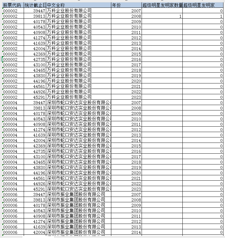 股票代码 统计截止日期 中文全称 年份 超级明星发明家数量 超级明星发明家