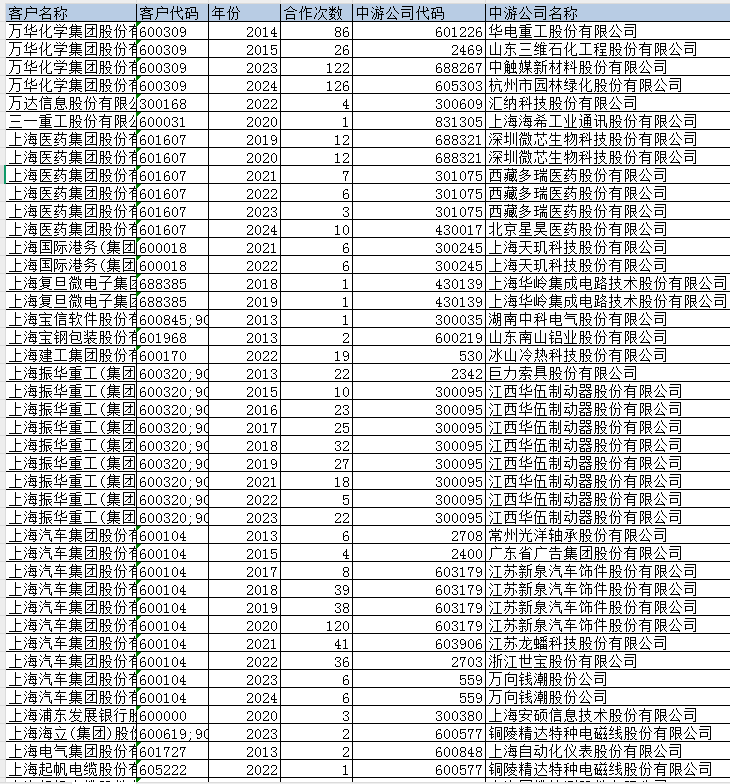 协同创新数据(供应商、客户):供应商名称 供应商代码 年份 合作次数 中游公司代码1 中游公司名称1 中游公司代码2 中游公司名称2 中游公司代码3 中游公司名称3 中游公司代码4 中游公司名称4 中游公司代码5 中游公司名称5 中游公司代码6 中游公司名称6 客户名称 客户代码 年份 合作次数 中游公司代码1 中游公司名称1 中游公司代码2 中游公司名称2 中游公司代码3 中游公司名称3 中游公司代码4 中游公司名称4