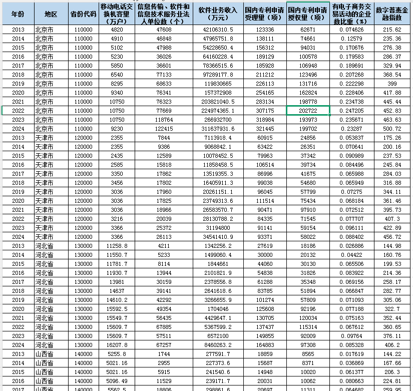 年份 省 省份代码 移动电话交换机容量(万户) 光缆线路长度(公里) 互联网宽带接入用户(万户) 互联网宽带接入端口(万个) 网页数(万个) 域名数(万个) 信息传输、软件和信息技术服务业法人单位数(个) 软件业务收入(万元) 国内专利申请受理量(项) 国内专利申请授权量(项) 有电子商务交易活动的企业数比重(%) 数字普惠金融指数 年份 省 省份代码 数字经济指数